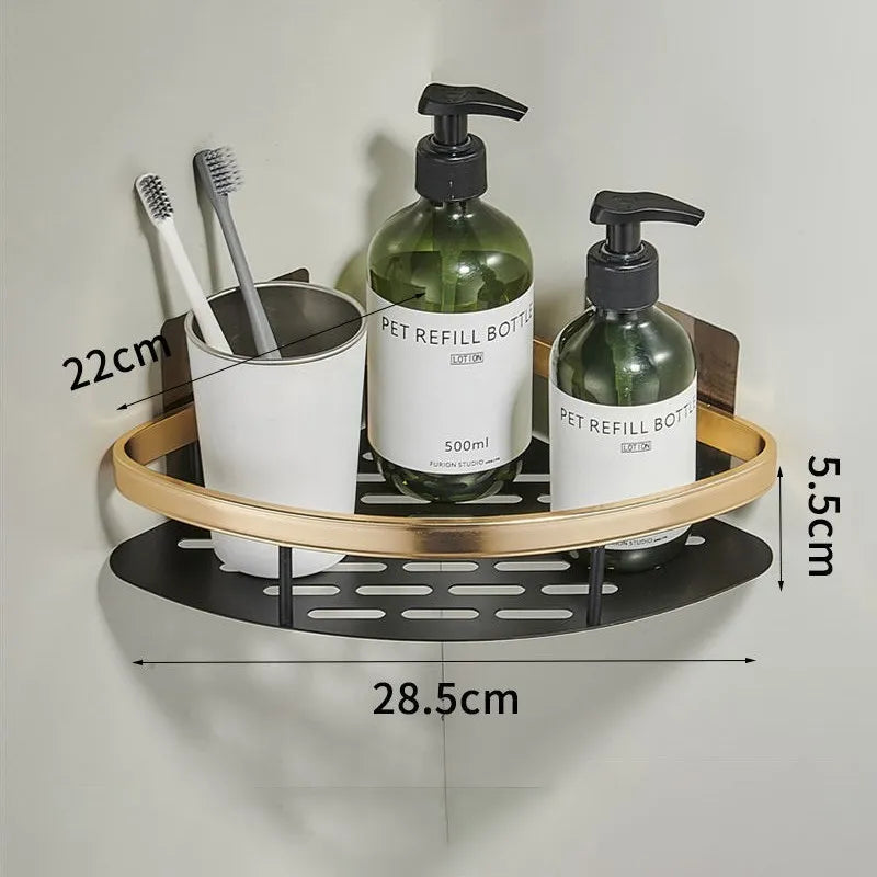 Unser Eckduschregal 2er Set ohne Bohren bietet Ihnen die ideale Kombination aus Funktionalität und Design. Die beiden Ablagen ermöglichen es Ihnen, all Ihre Badutensilien übersichtlich zu verstauen, von großen Shampoo-Flaschen bis hin zu kleinen Seifenstücken oder sogar Deko-Elementen, wie auf dem Bild zu sehen ist. Dank der innovativen Klebemontage sparen Sie sich nicht nur das Bohren und damit unschöne Löcher in Ihren Fliesen, sondern auch Werkzeug und viel Zeit. Die Halterungen sorgen für einen extrem starken Halt, sodass Sie sich keine Sorgen um herunterfallende Gegenstände machen müssen. Gefertigt aus robustem, rostfreiem Material und in einem eleganten Schwarz mit edlen Goldakzenten, ist dieses Regal nicht nur ein Blickfang, sondern auch extrem langlebig und pflegeleicht. Die cleveren Ablauflöcher verhindern zudem Wasseransammlungen und sorgen für eine hygienische Aufbewahrung Ihrer Produkte.