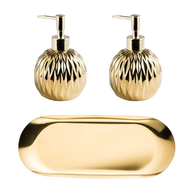 Jedes Detail dieses luxuriösen Seifenspenders in Gold-Optik wurde sorgfältig durchdacht, um ein Produkt von unvergleichlicher Schönheit und Funktionalität zu schaffen. Die geometrisch inspirierte Textur ist nicht nur optisch ansprechend, sondern sorgt auch für eine angenehme Haptik. Gefertigt aus robustem Material, das für Langlebigkeit und eine beständige Ästhetik steht, werden Sie viele Jahre Freude an diesem Stück haben. Die hochwertige Pumpe garantiert eine sanfte und präzise Dosierung Ihrer Lieblingsflüssigseife oder Lotion, während der goldene Glanz auch nach häufigem Gebrauch seinen Charme behält. Erleben Sie, wie dieser Seifenspender eine warme, einladende Atmosphäre schafft und gleichzeitig den praktischen Anforderungen Ihres modernen Lebens gerecht wird.